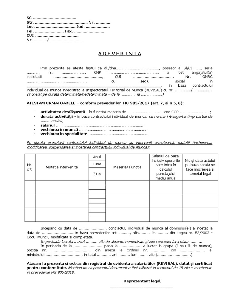 Model de fisa de inscriere plus adeverinta de vechime si calificativ. În cazul bugetarilor, modelul adeverinței de vechime în muncă este stabilit prin hotărârea guvernului nr. Adeverinta de detasare este utilizata de intreprinderi, in momentul in care se efectueaza detasarea unui. Vechime in munca minim 3 ani; Folositi linkul urmator pentru download model de adeverinta de vechime in format document.