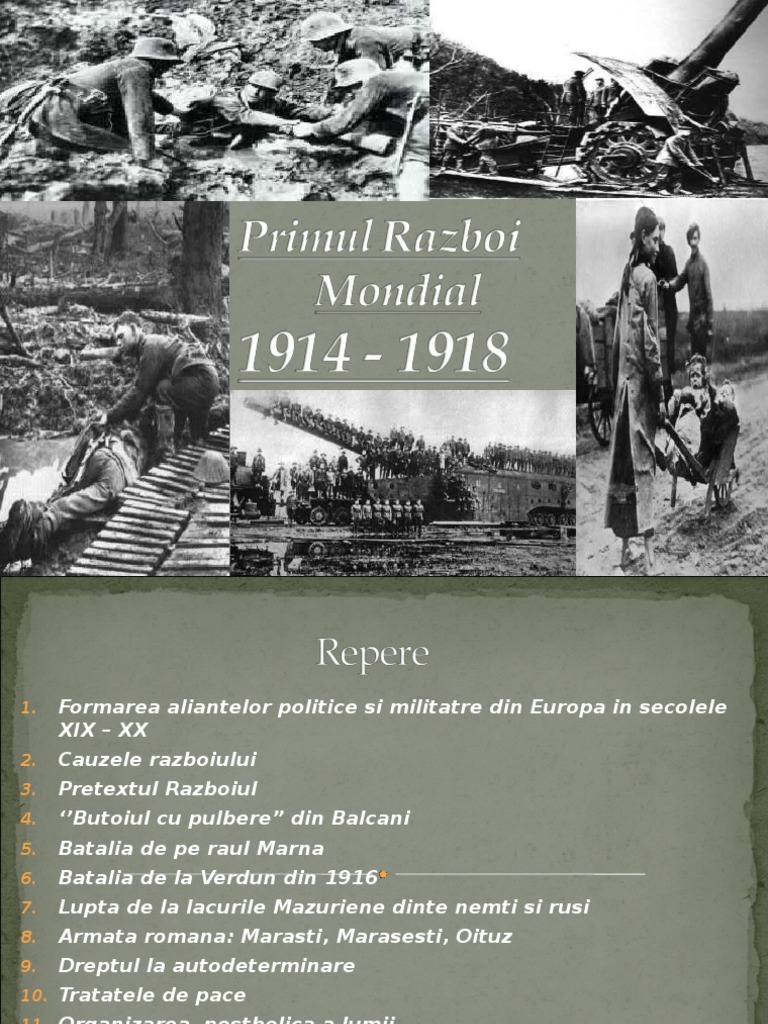 vizitati articolul complet aici : https://www.rri.ro/ro_ro/secolul_romanesc_al_primului_razboi_mondial-2551864 1.lupta pentru pietele de desfacere si sursele de materii prime slideshow 2229676 by nitesh. Ajutorul financiar, materiile prime de război, furnizarea materialului de război, stabilirea serviciului militar obligatoriu și trimiterea în regim. Tranșee pe frontul de vest, avioane biplane germane (albatros d.iii), tancul britanic mark i, servantul unei mitraliere vickers purtând o mască de gaze, scufundarea navei britanice hms iresistible, din cauza unei mine, la dardanele.